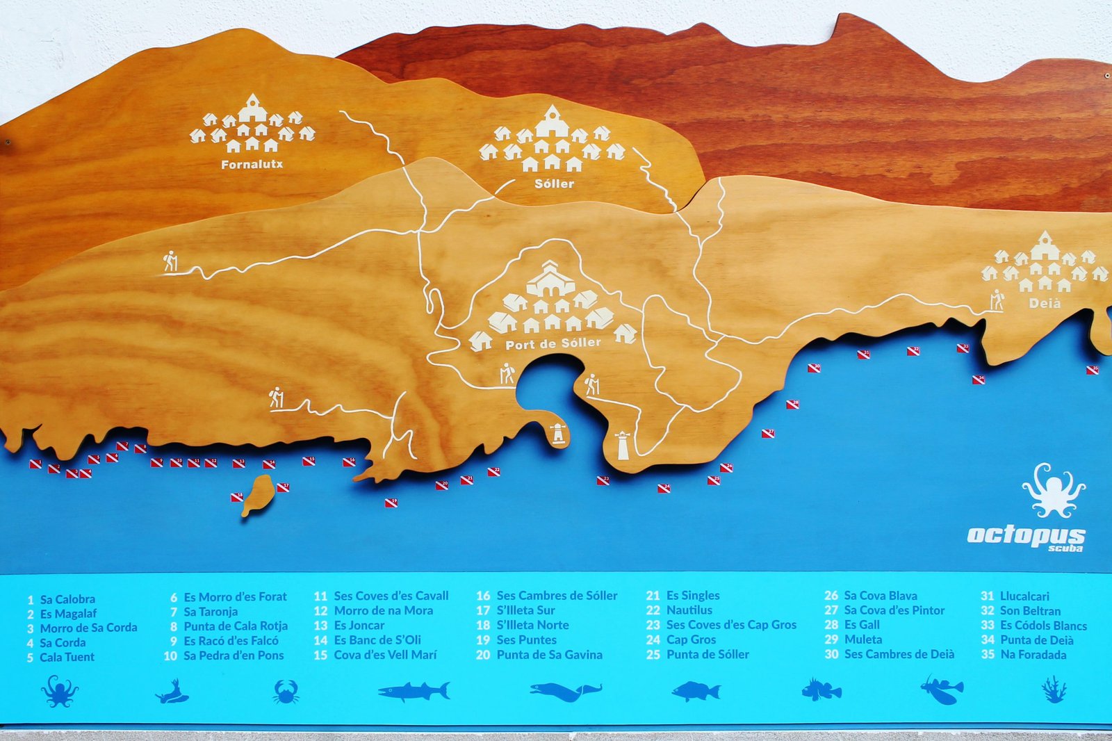 Octopus Scuba had changed ownership and needed to restyle and update their presence if they were to appeal to potential new, high-end customers. Because of their main brand values: high customer service and extreme fun, we created a series of elegant and clean materials for both indoors and outdoors. For the indoor material, we created a series of training and selling aids making it easier to explain to clients how the dive center worked. Outdoors, we restyled their facade and created a custom wooden map with all the dive sites as well as hiking trails making it appealing to curious active tourists in the area.
